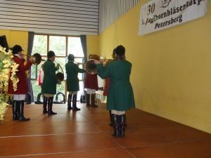 Nun ging ein Hilferuf an die Jagdhornbläser-Gilde. Brigitte Spranger von der Gilde nahm sich der Sache an und suchte in unserer näheren Umgebung nach einer Bläsergruppe, die dann tatsächlich ca. 100 km südlich von uns in dem 1. Jagdhornbläserkorps Petersberg e. V. (www.blaeserkorps-petersberg1.de) gefunden wurde. Bläserinnen und Bläser aus dieser Gruppe unterstützten uns 2018 tatkräftig bei den Hubertusmessen. Heute ist die Hilfe gegenseitig, so dass wir und auch die Petersberger mit ihrer Gruppe ebenfalls wieder blasfähig sind. Von dieser Stelle aus tausend Dank an die Petersberger Jagdhornbläser! Und: Danke Biggi!!